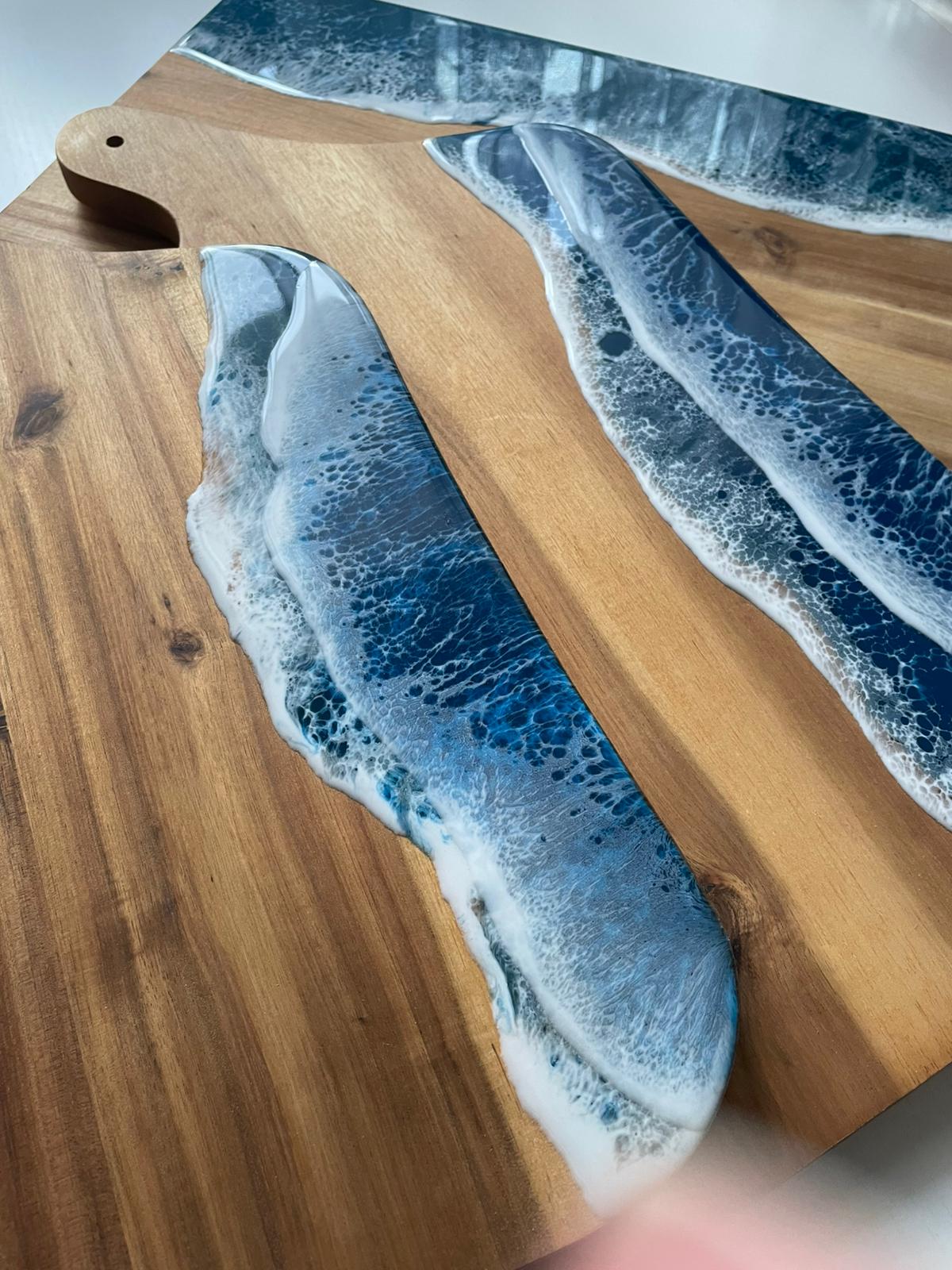 Ručne vyrábaná doska na krájanie z kvalitného orechoveho dreva, doplnená o originálnu dekoráciu z živice pripomínajúcu jemné morské vlny. Každý kúsok je jedinečný – prirodzená štruktúra a odtieň dreva sa môžu líšiť a aj vzor vytvorený živicou je vždy unikátny, takže neexistujú dve úplne rovnaké dosky.